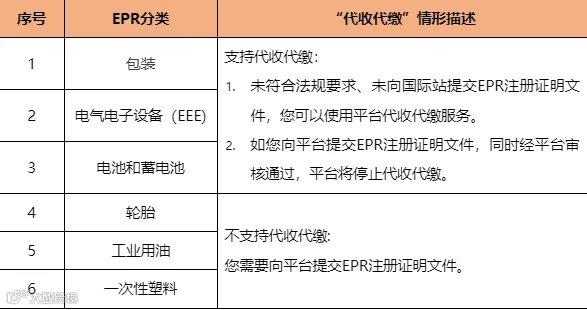 阿里巴巴国际站暂无法支持代收代缴的商品类别(包含轮胎、工业用油、一次性塑料),需向国际站提供您的EPR注册证明文件,阿里巴巴国际站支持代收代缴的商品类别(包含包装、电子电气设备、电池和蓄电池),您可以向国际站提供EPR注册证明文件,亦可以选择使用国际站代收代缴服务,如果您未向阿里巴巴国际站提供EPR注册,或亦未使用阿里巴巴国际站代收代缴服务,阿里巴巴国际站对不合规商品将采取包括但不限于交易打断、国别屏蔽措施。