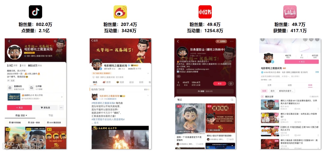据艺恩营销智库数据,《哪吒2》官方抖音账号已狂揽802万粉丝,收获点赞量 2.1 亿。