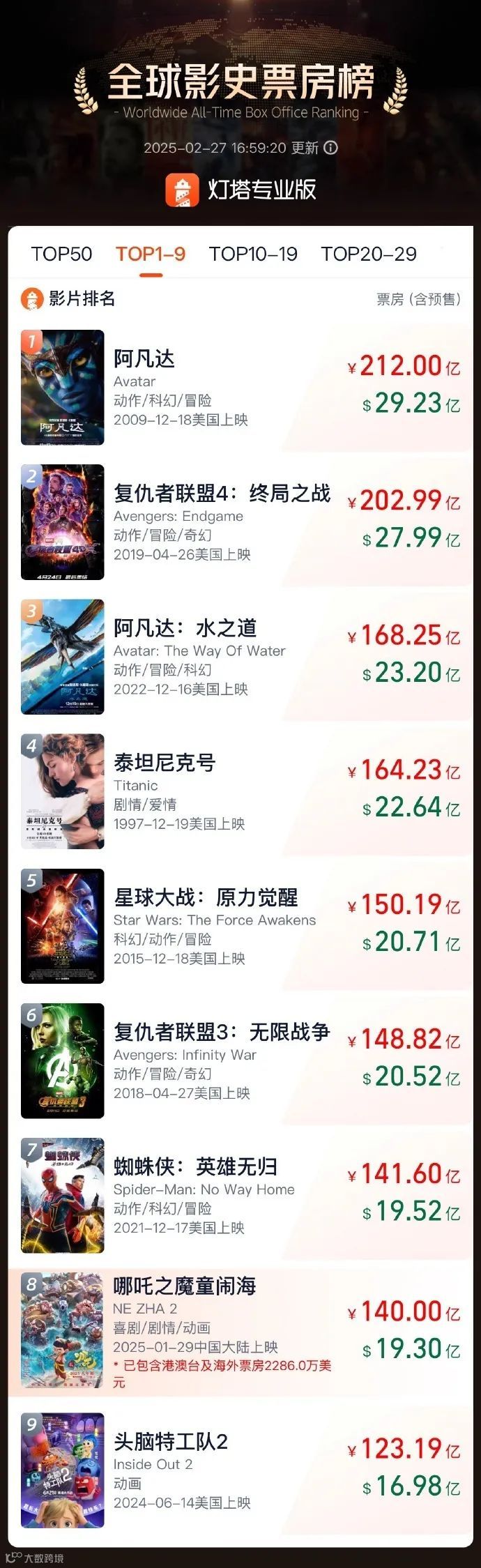 2025 年春节档,《哪吒之魔童闹海》(简称《哪吒2》)可真是火出圈了!截至2025年2月27日,这部国漫神作全球票房突破140亿元,高居全球影史TOP8,IMDB评分高达8.4分,烂番茄观众喜爱度更是飙至99%!