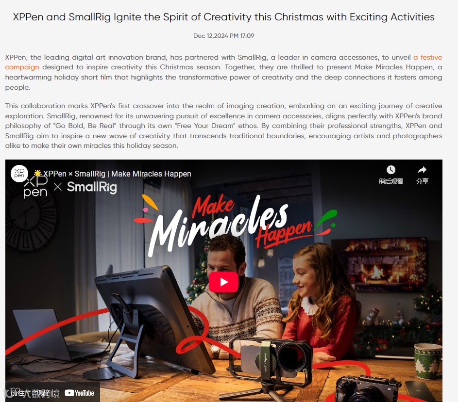 2024年圣诞节,XP-pen发布短片宣布与知名摄影配件品牌SmallRig合作。短片展示了相机配件和数位板结合能产生变革性的创造力,旨在鼓励艺术家和摄影师跨越行业界限,尽情释放想象力。