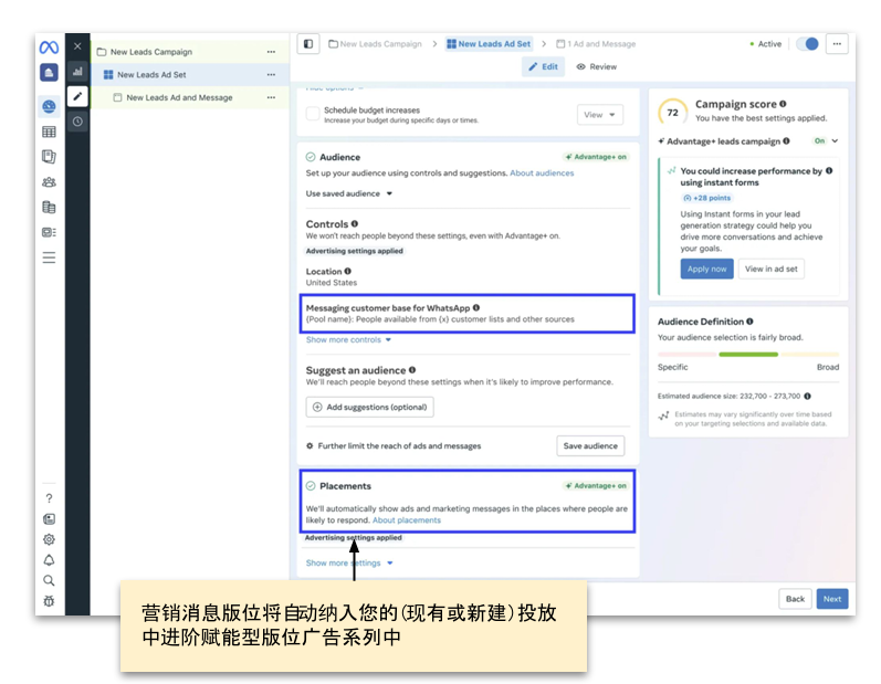 无论采用哪种版位设置,要想最大限度提升营销消息在潜在客户广告系列 (或其他任何销量与流量目标广告系列)中的表现,Meta 均建议向营销消息客户群中添加尽可能多的客户。