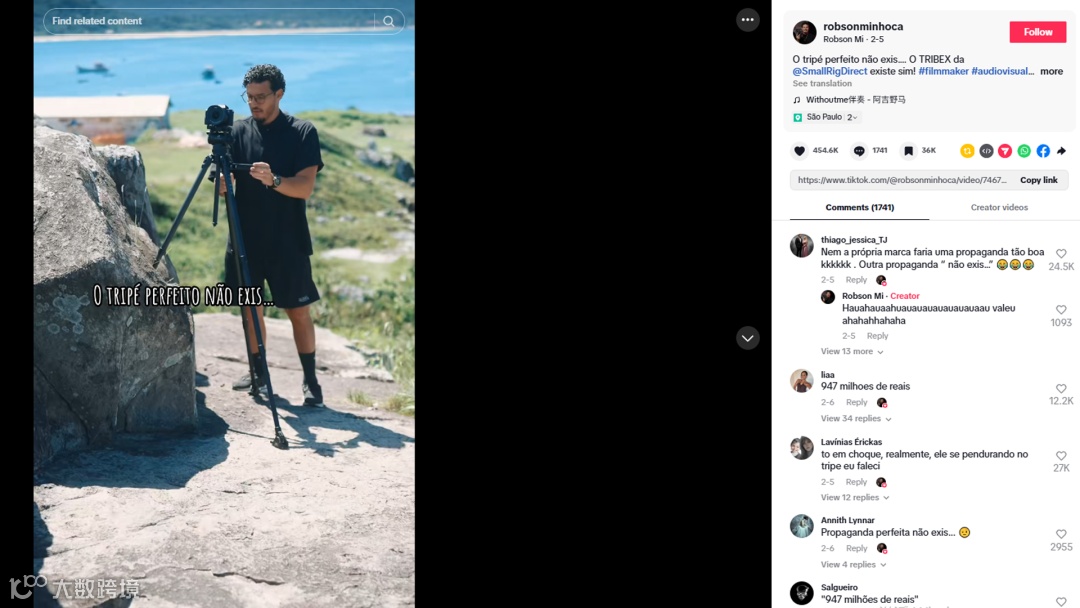例如来自TikTok的摄影博主@robsonminhoca,他是一位专业电影制作人,本身就活跃于影视行业,他分享的大部分内容都是实用的摄影器材,其专业背景与SmallRig的品牌调性高度契合。