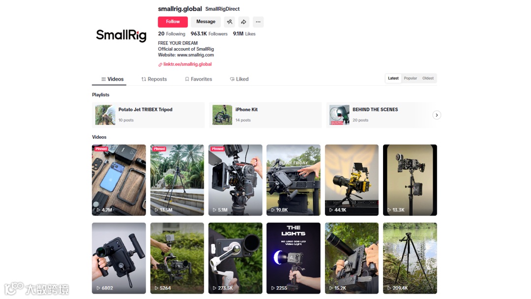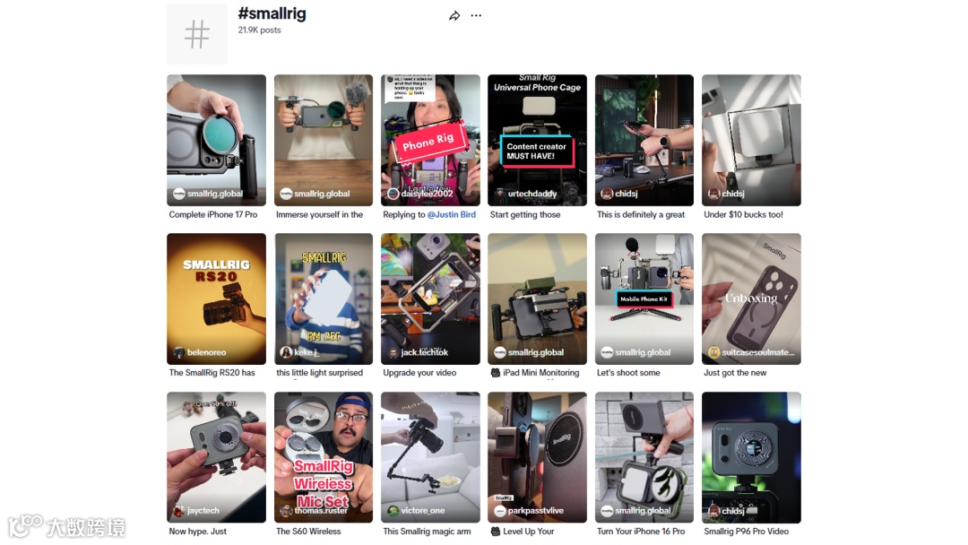 SmallRig在TikTok上的官方账号@smallrig.global已积累近96.3万订阅,其发布的内容是大量与摄影创作相关的短视频教程和产品测评内容。