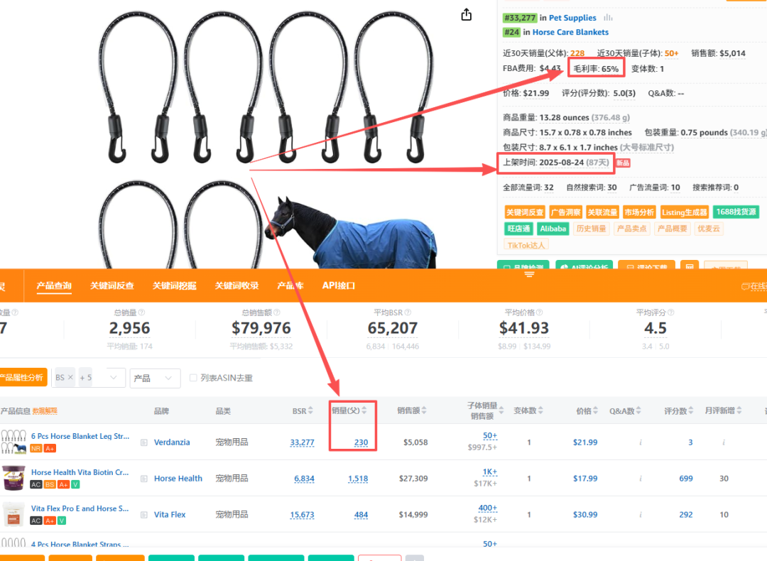 单量:上架时间2025年08月24日,目前为止持续销售90天;30天销售量230;毛利润65%;