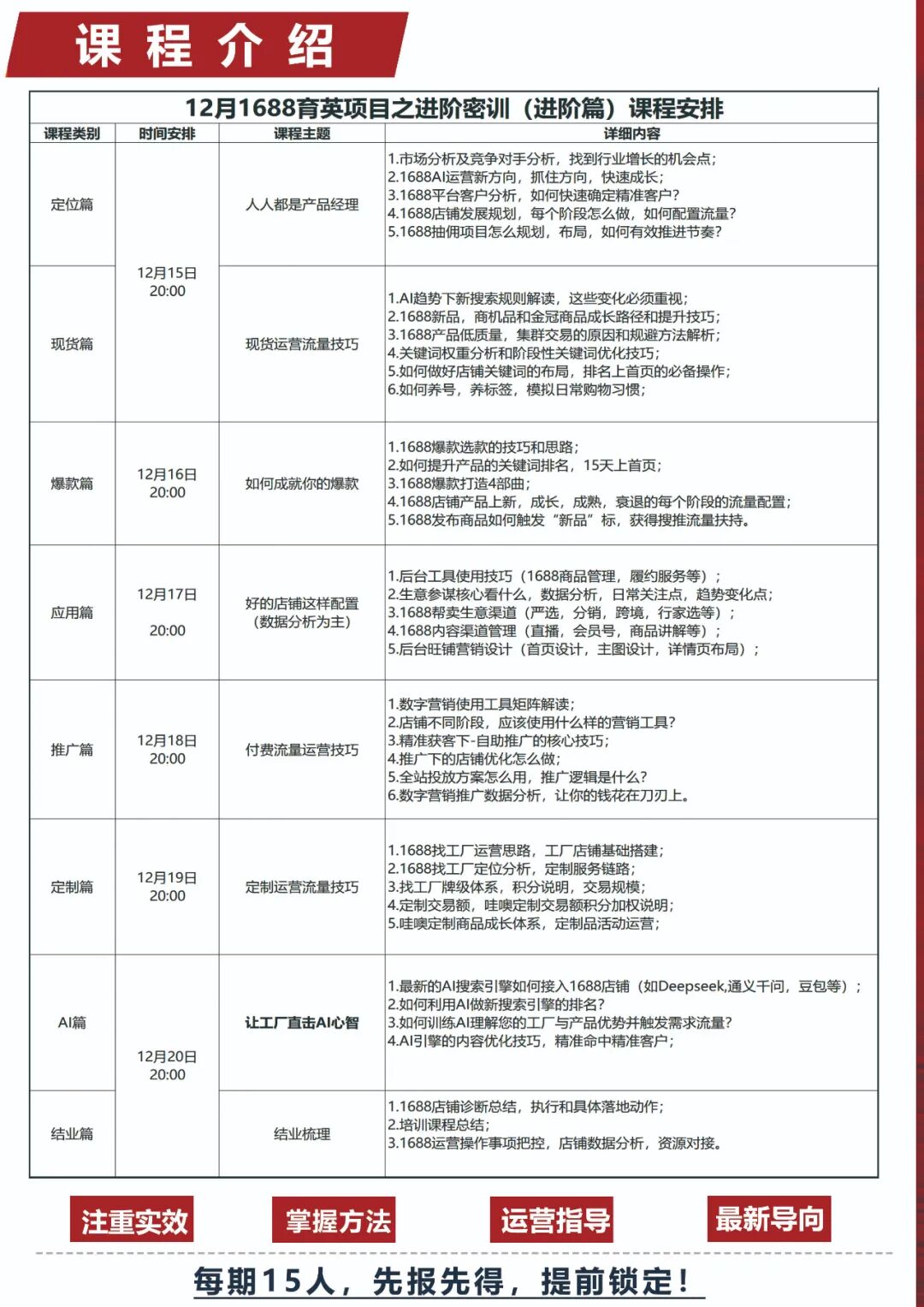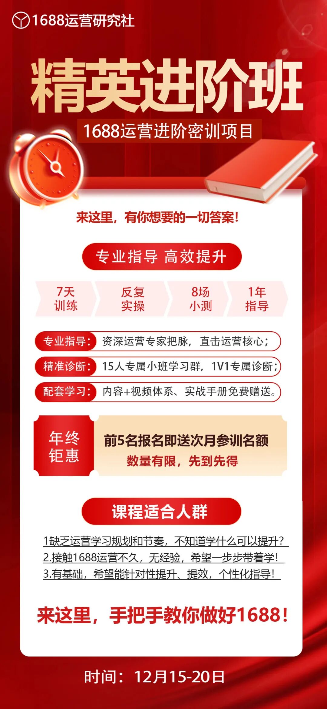 最新战报:12月1688运营进阶培训15个珍贵席位已开启预约(5/15)!每次开放报名都引发1688商友抢位风暴,这背后是实实在在的学员口碑在推动!