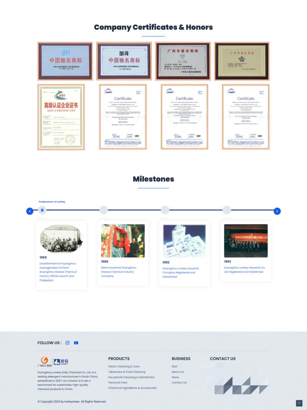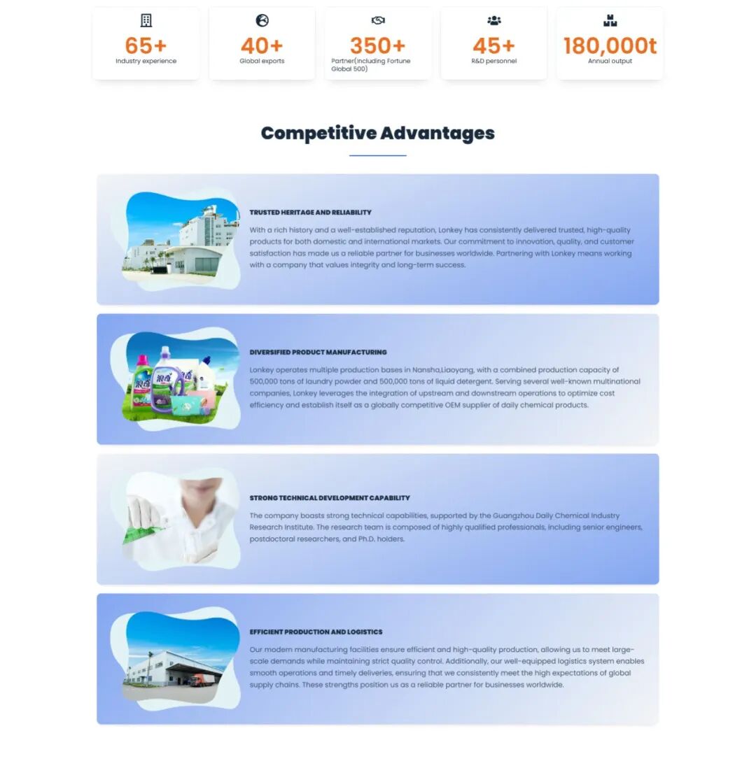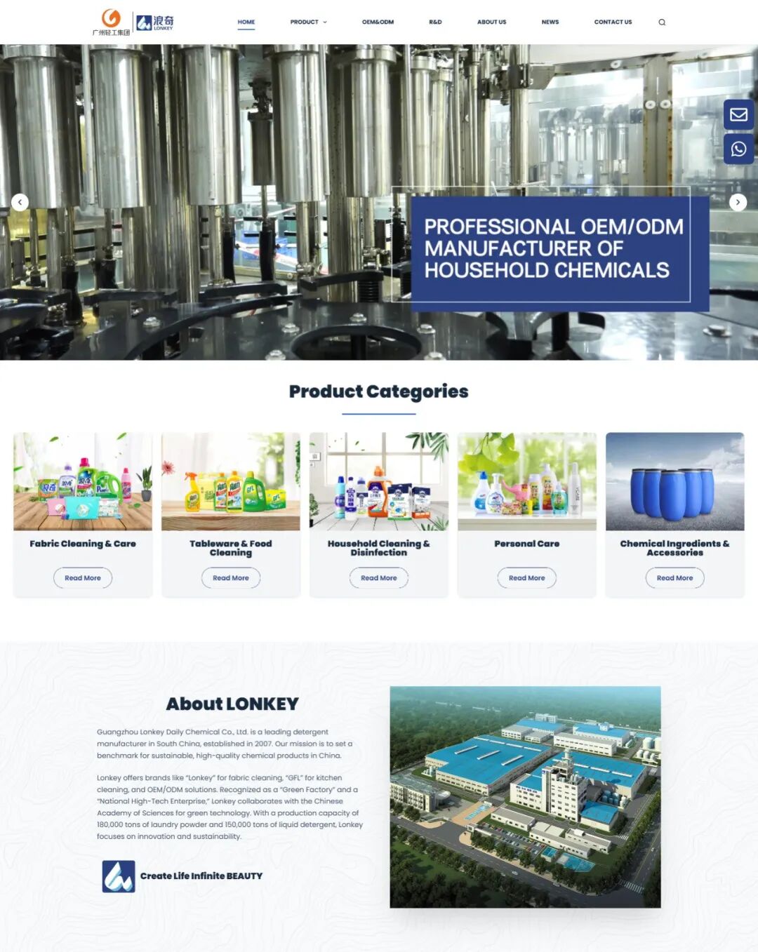 这是我们为一家专业的 日化产品制造商与OEM/ODM服务提供商 打造的外贸独立站。网站主要展示企业在 织物清洁与护理、餐具清洗、家用清洁与消毒、个人护理及化工原料 等领域的产品与解决方案。