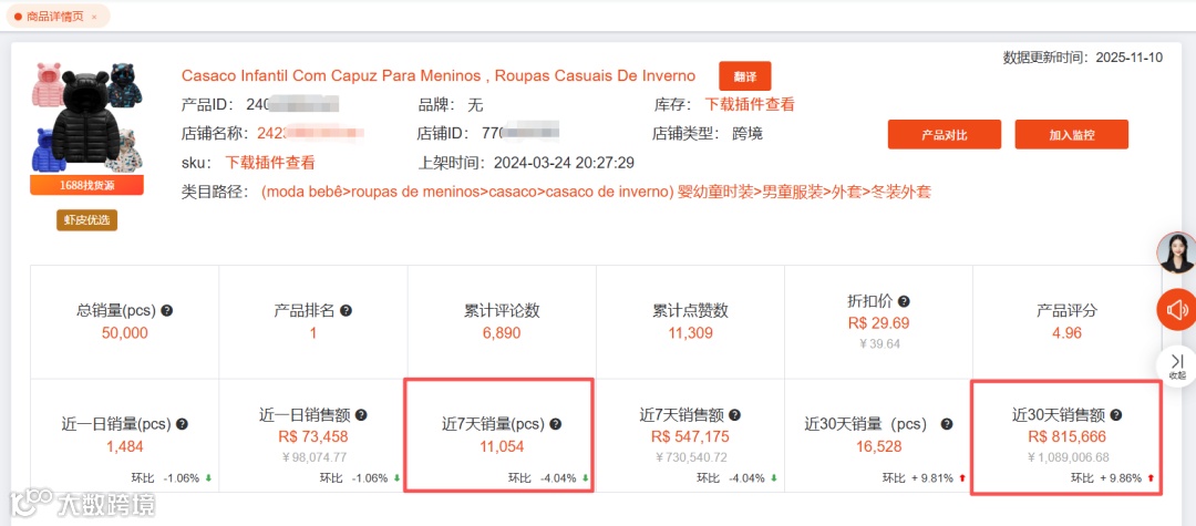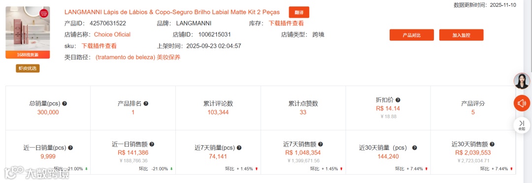 知虾数据显示,巴西站点一款裸色系唇线笔 + 哑光/亮面唇蜜套装在 7 日内售出 74,141 件,成为兼顾实用与精致的代表性爆款。