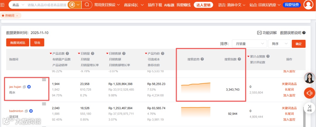 知虾数据显示,在印度尼西亚站点,“雨衣”搜索指数达到了惊人的 3,343,743;而“雨伞”搜索指数也已经达到了 1,415,140。