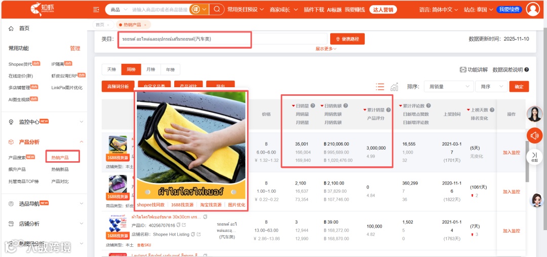 在多个站点中,汽车吸水抹布成为典型爆款,在泰国站点,其日销量高达 35,001 件,销售额达 210,006泰铢。