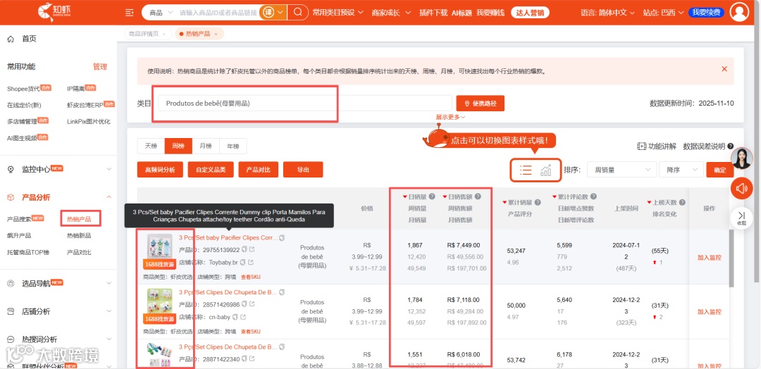 东南亚的年轻父母群体消费力持续提升,他们追求产品的安全性、便利性与可爱设计感,比如近期热销的安抚奶嘴防掉链,在巴西站点日销量高达 1,867 件。