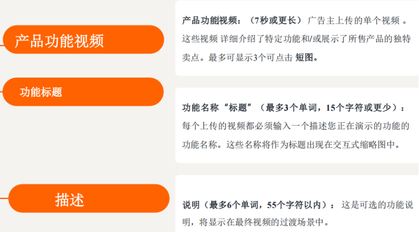 广告主可以为每件商品上传1到5个商品功能视频,并为每项功能添加描述性文字。