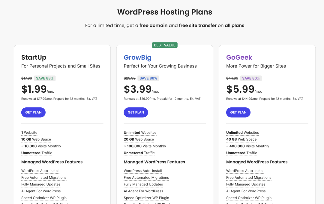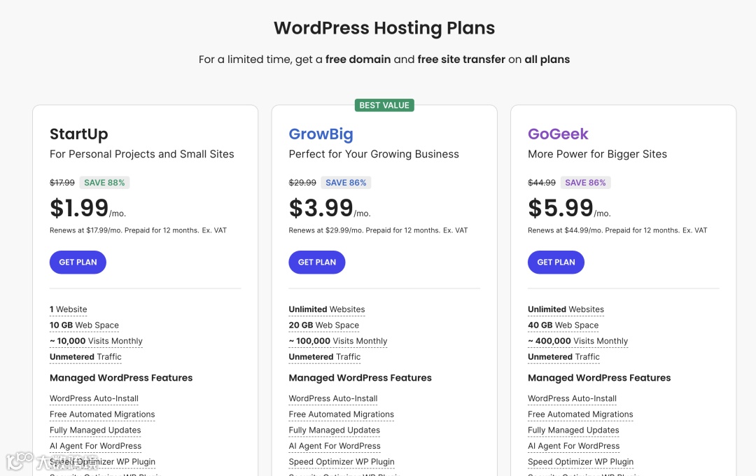 价格(首购): 最便宜的共享主机/WordPress 托管方案大约在 $1.95 - $2.75/月。