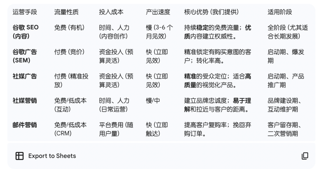 列举谷歌SEO,谷歌广告,社交媒体等等主流的运营手段