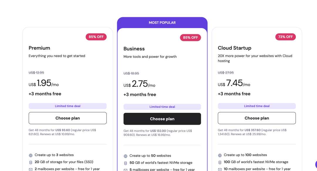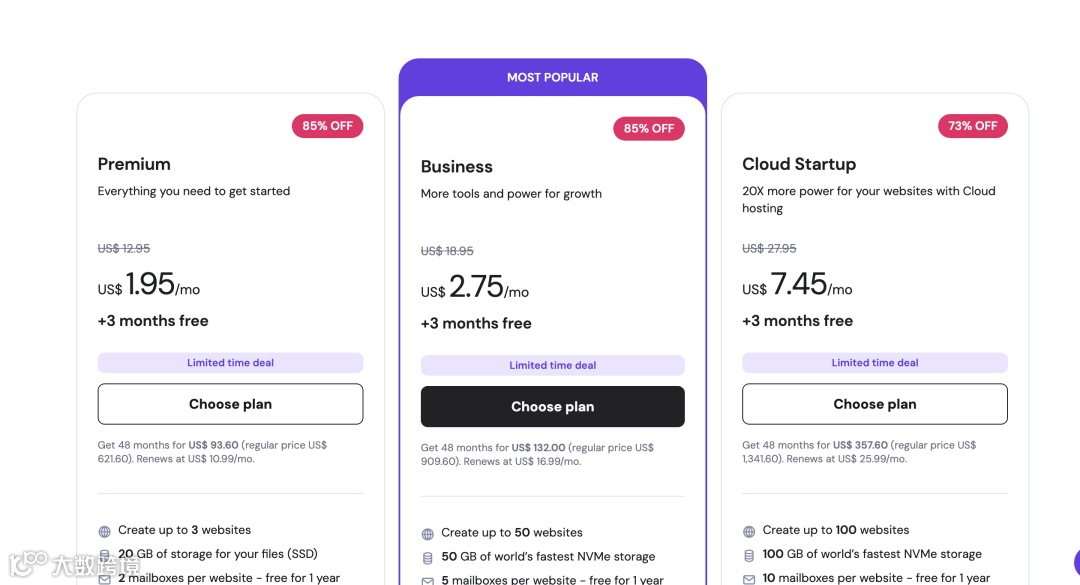 价格(首购): 入门级方案(StartUp)大约在 $2.99 - $3.50/月 左右。
