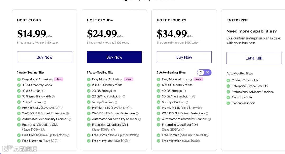 价格(月费): 起步价通常在 $25.00/月 左右,价格是最高的。