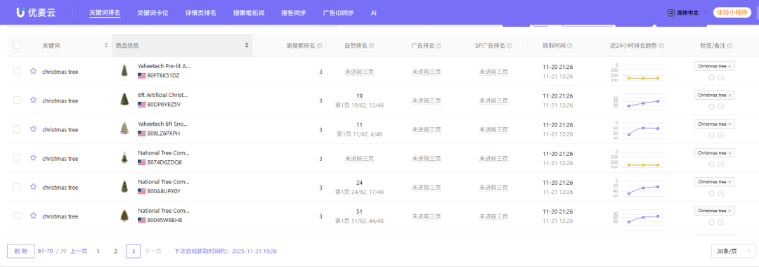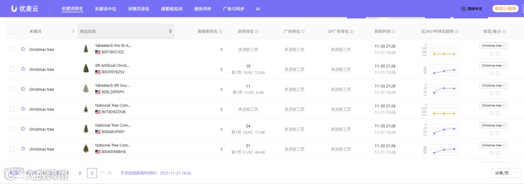 第三步:在商品监控页面,你可以看到监控ASIN在关键词下的实时表现情况。