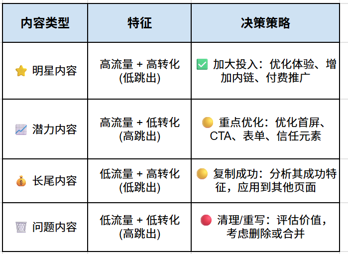 • 🟡 一般流量:内容有一定价值,但吸引力不足。行动:提升内容深度和网站用户体验。