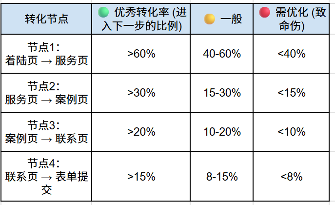 [着陆页] --(流失点1)--> [服务页 P1] --(流失点2)--> [案例页 P3] --(流失点3)--> [联系页] --(流失点4)--> [✨询盘成功]
