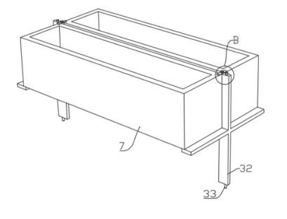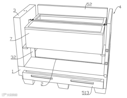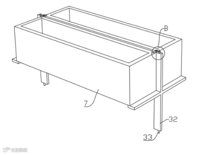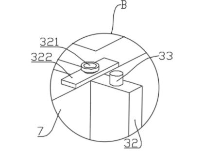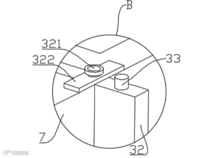 4.十字支撑板与周转箱系统:调节槽(2)内可滑动设置多个十字支撑板(32),通过锁紧螺杆(33)与槽内内螺纹孔(34)配合固定。两个十字支撑板(32)可共同支撑两个周转箱(7)。十字支撑板(32)垂直端顶部通过连接螺栓(321)安装水平压板(322),压紧周转箱顶部,确保其稳固。