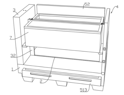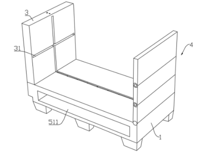 2.固定侧壁与活动侧壁:固定侧壁(3)和活动侧壁(4)分别设置于调节槽(2)长度方向的两端。其中,活动侧壁(4)为核心创新点之一,由铰接在底座上的侧板一(41)以及首尾依次铰接的多个侧板二(42)组成。通过翻转不同数量的侧板至水平状态,可灵活扩展承载面长度,以适应超长物品。