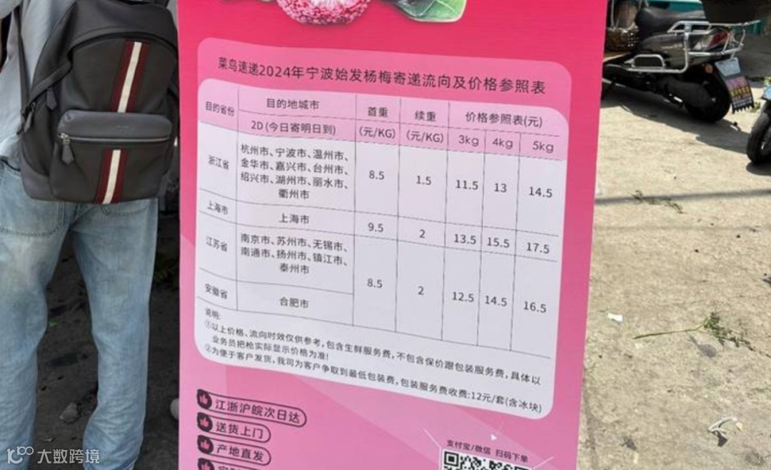 菜鸟主打性价比路线,推出48小时上门服务,覆盖杨梅、樱桃等时令水果。以洛阳樱桃为例,5斤包裹运费24元,约为顺丰航空件的一半[[k]]。