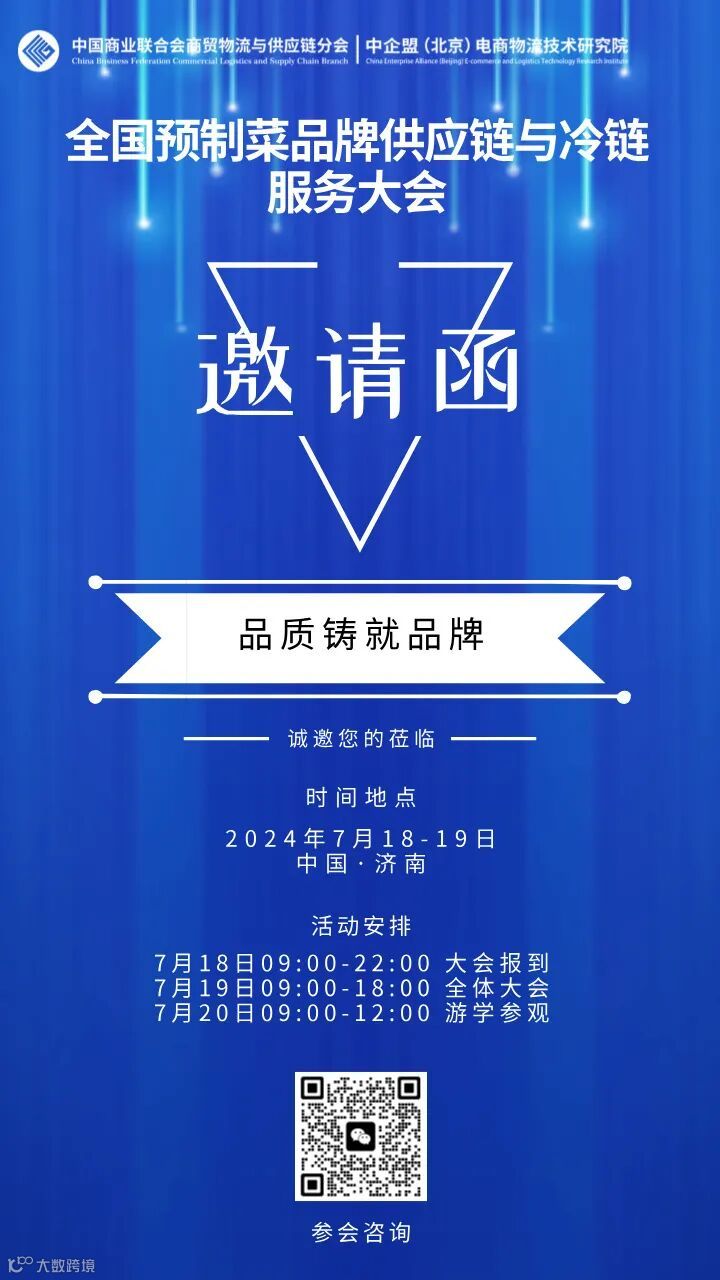 由中国商业联合会、山东省商务厅指导,中国商业联合会商贸物流与供应链分会主办的“全国预制菜品牌供应链与冷链服务大会”将于7月18-19日在中国济南召开。