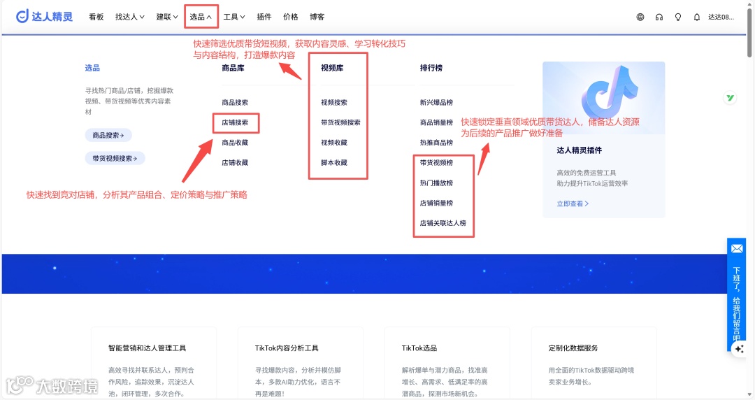 达人精灵网页端「TikTok选品-店铺搜索/视频库/排行榜」等功能操作指引