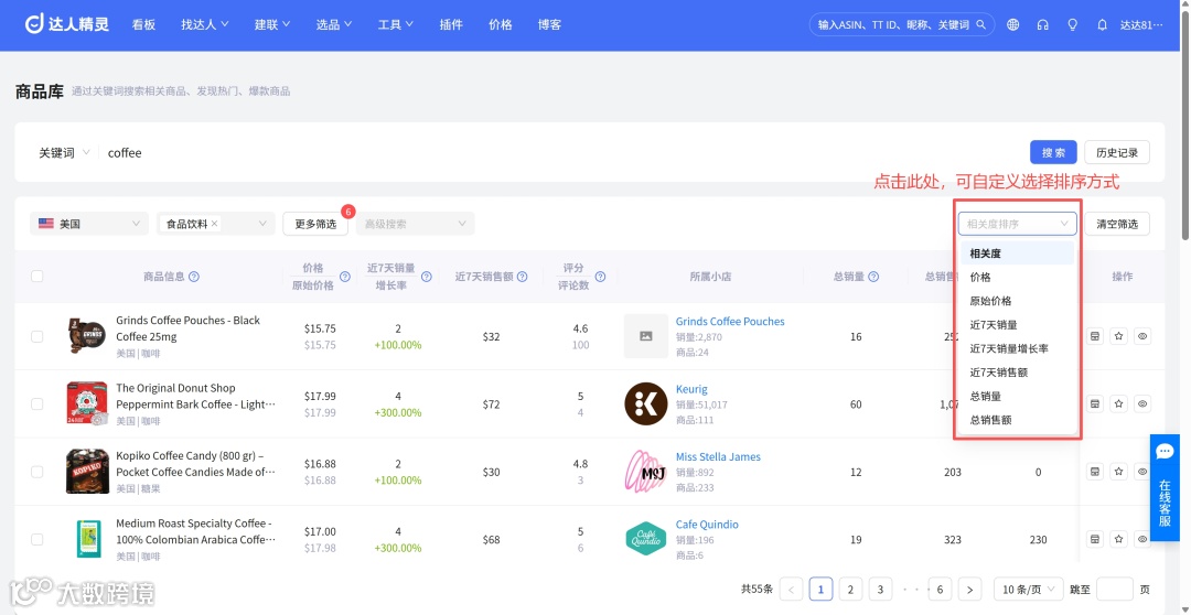 达人精灵网页端「TikTok选品-关键词搜索-排序条件」操作指引