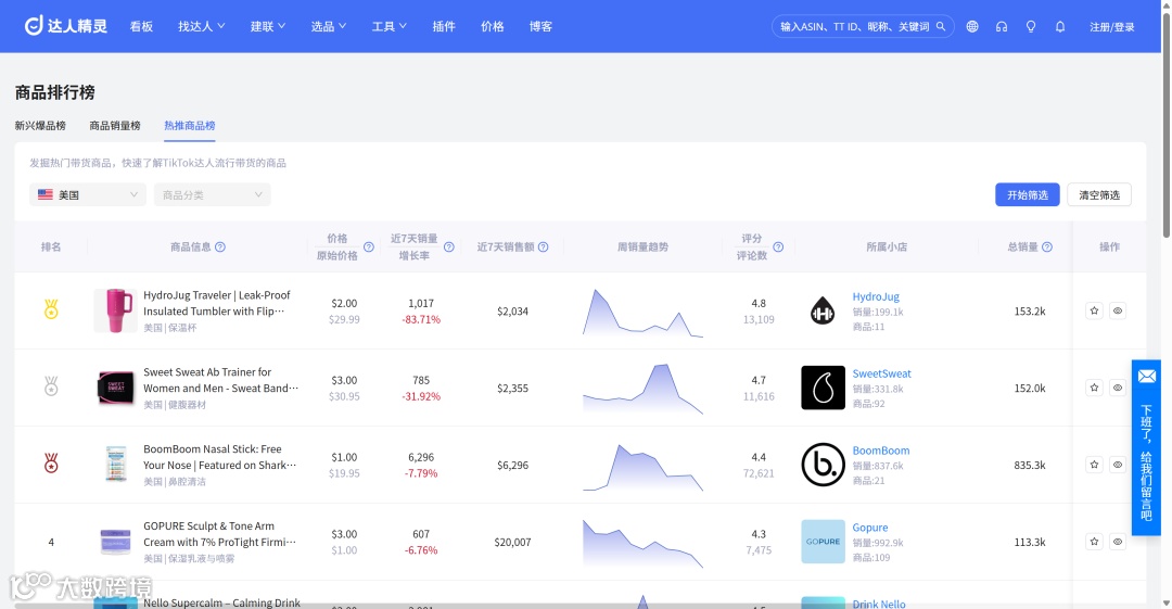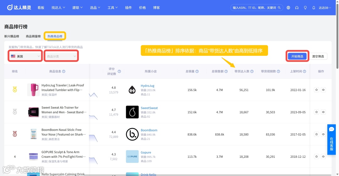 达人精灵网页端「TikTok选品-热推商品榜」功能页面