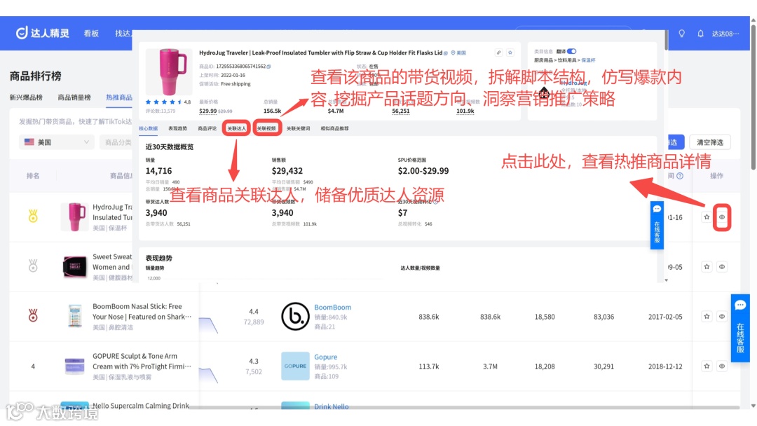 达人精灵网页端「TikTok选品-热推商品榜-查看详情」使用示例