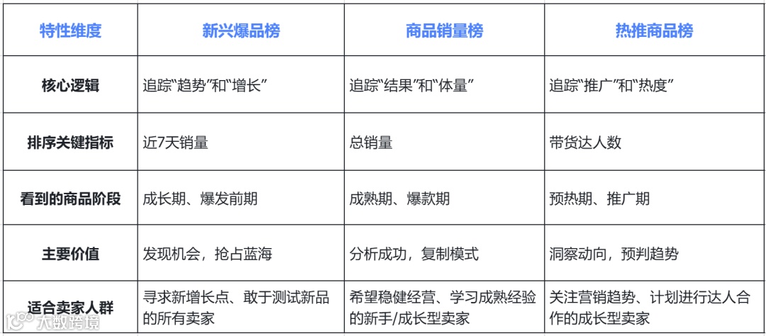 A:在跨境选品的实战场景中,新兴爆品榜/商品销量榜/热推商品榜的区别与应用如下: