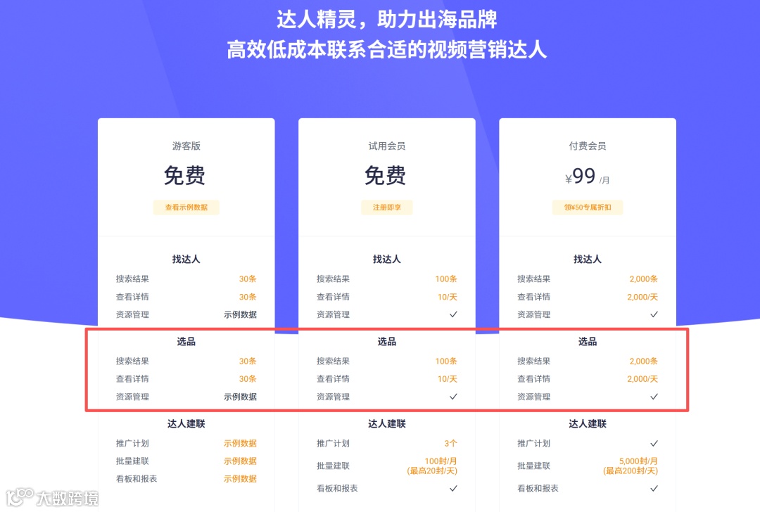 A:达人精灵网页版「TikTok选品」功能,目前提供有游客版(免费)、试用会员(免费)以及付费会员三种使用模式。