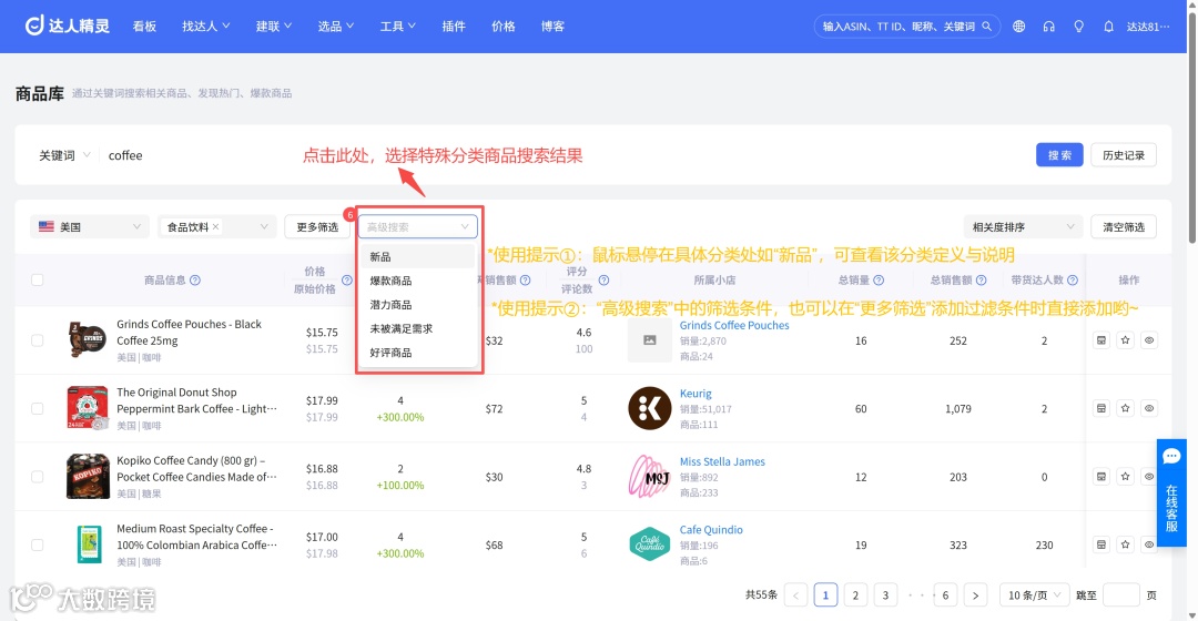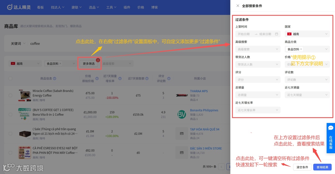 达人精灵网页端「TikTok选品-商品库-关键词搜索-高级搜索」操作指引