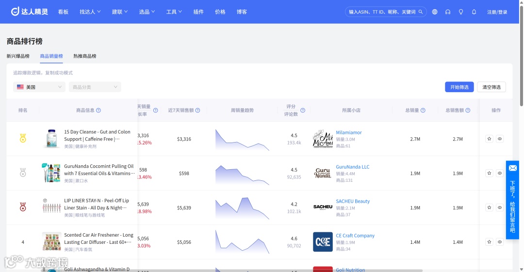 商品销量榜:分析历史销量领先的成熟爆款,你可以学习成功模式,进行稳健选品