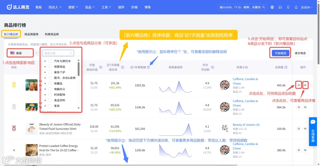 达人精灵网页端「TikTok选品-排行榜-新兴爆品榜」操作指引