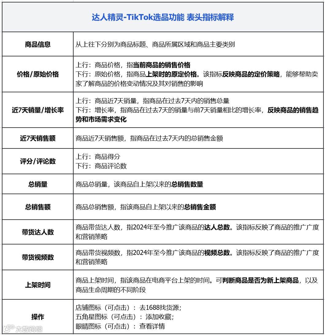 达人精灵网页端「TikTok选品」表头指标解释说明