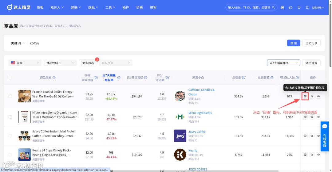在使用「TikTok选品-商品搜索」功能时,点击右侧“店铺”图标,可直接跳转至“1688跨境电商”货源页面,直接发起选品流程;
