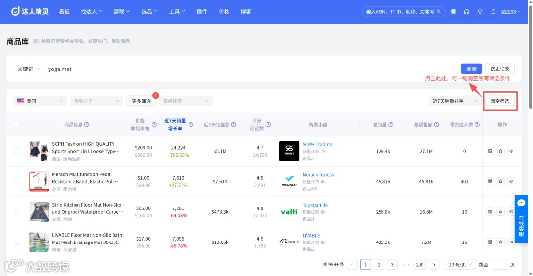 达人精灵网页端「TikTok选品-清空筛选」操作指引