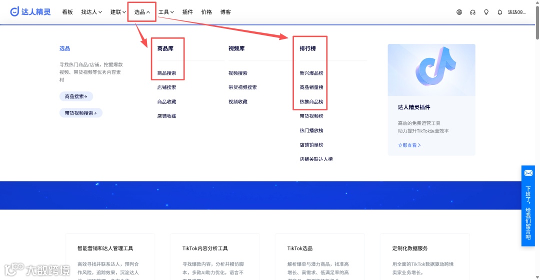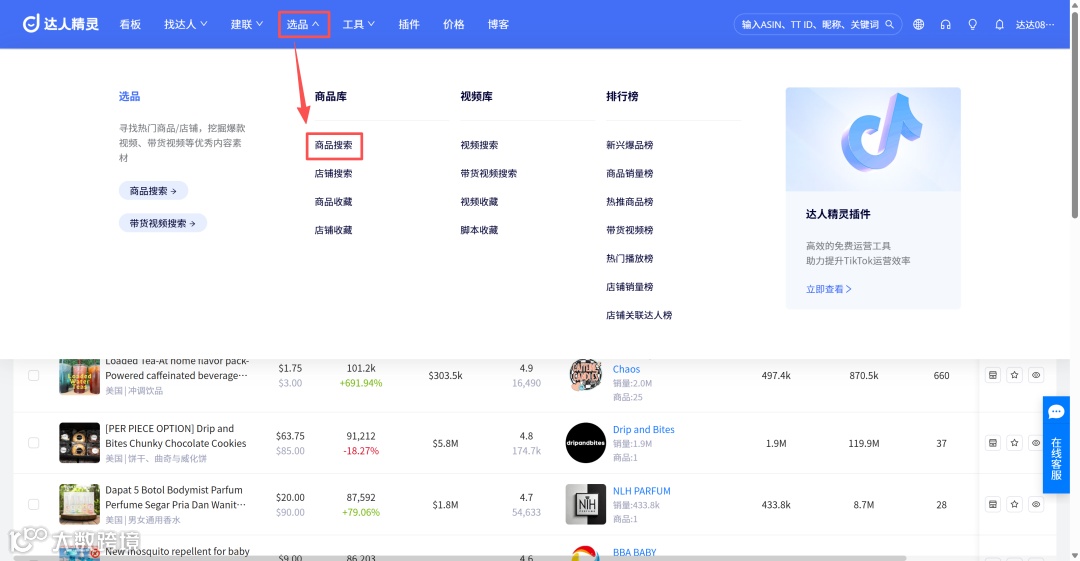 功能路径:达人精灵网页端>>顶部导航栏点击“选品”>>【排行榜】/【商品库-商品搜索】