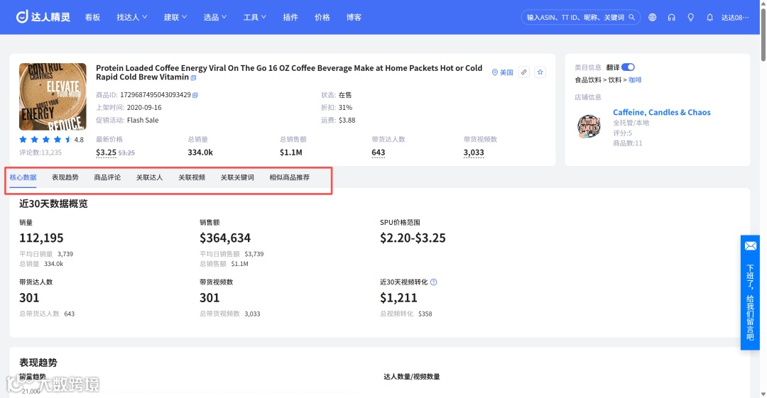 在产品详情页,可查看产品的详细数据表现,包括:近30天数据概览、表现趋势、商品评论、关联达人、关联视频等,对目标商品进行深度拆解与数据分析。
