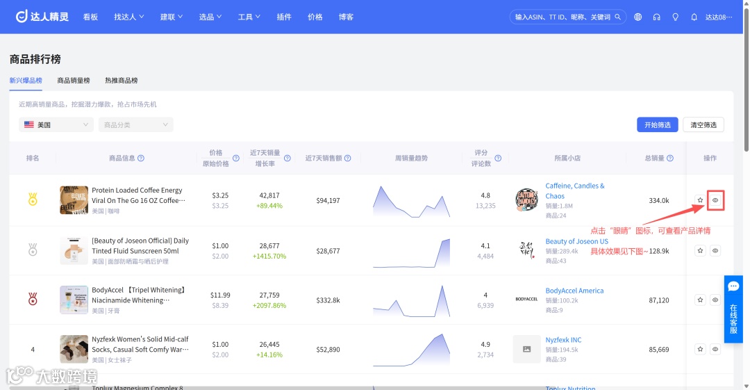 在使用「TikTok选品-排行榜/商品搜索」功能时,对目标产品可以点击右侧“眼睛”图标,查看产品详情。