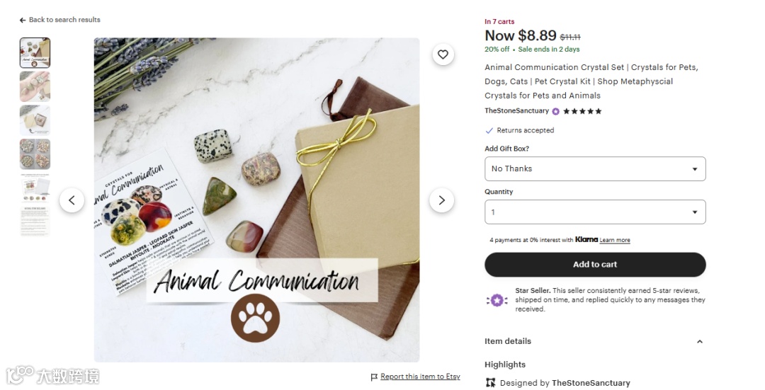其中一款“动物沟通水晶套装”上线4年,销量达20.4w件,销售额达181.3万美元(约1285.4万元)。这款产品包含4款不同的水晶,将这些水晶放置在家中宠物最喜欢的地方附近,可以让能量充满该区域,带来积极的影响。