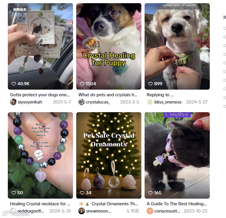 在TikTok上搜索“pet crystal”,视频内容也形态各异:既有为宠物量身定制的水晶装饰,也有将水晶雕刻成萌宠形态的精致饰品,甚至还有将水晶置于宠物身边、声称能为它们带来安抚与疗愈的分享场景。