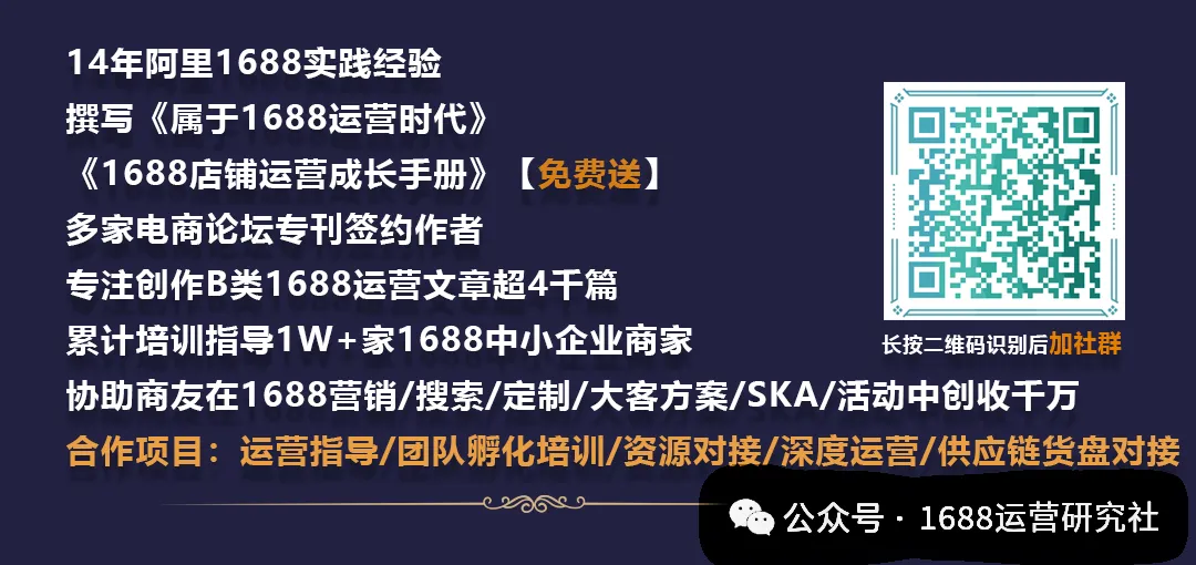 有深度的1688运营研究者集聚地,专注1688店铺运营研究,解决1688商友店铺运营问题,提供1688商友密训指导、运营、实战于一体的系统化服务,让运营有道有术,下方1688运营研究社公众号,你一定要关注学习的1688成长秘籍,关注后对接领取1688店铺运营成长手册,干货满满!