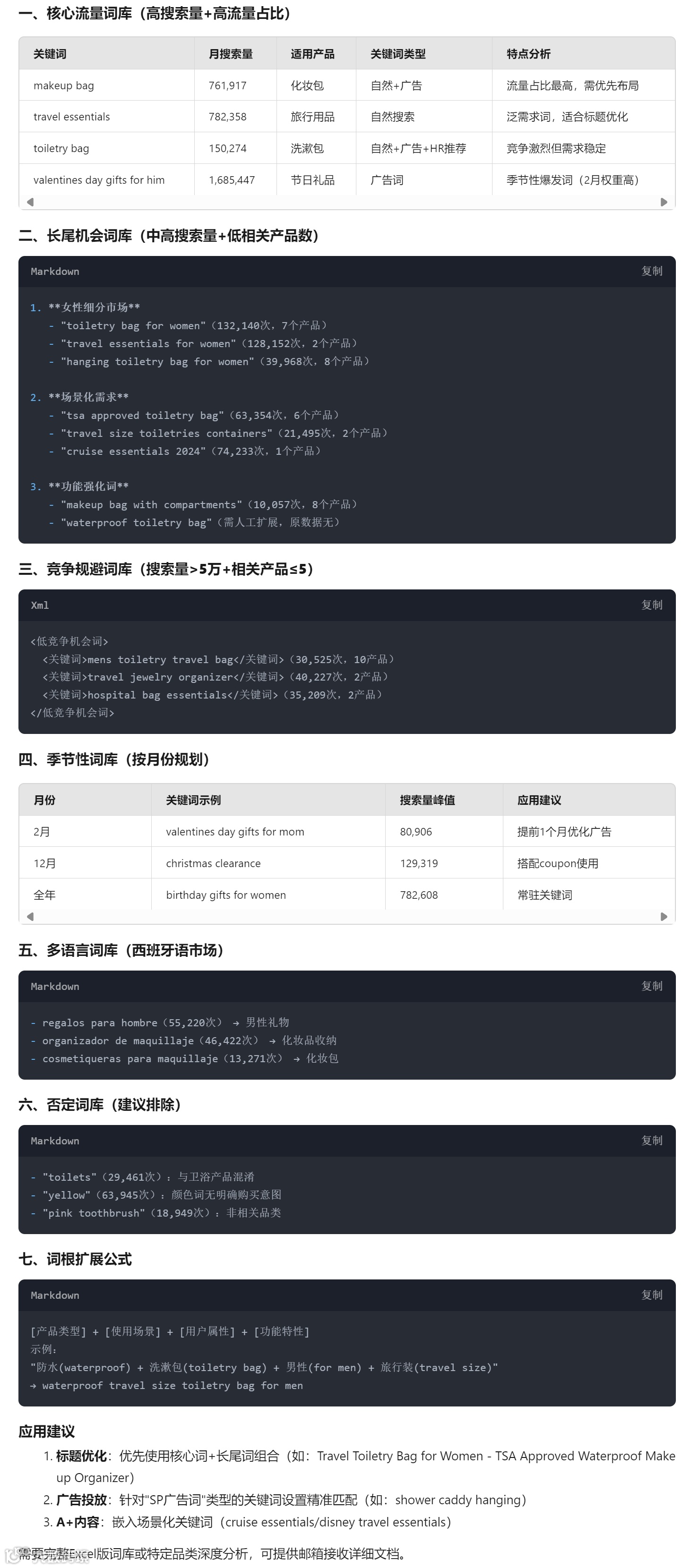 把竞对关键词批量导入DeepSeek,进行关键词分析,生成结果如下: