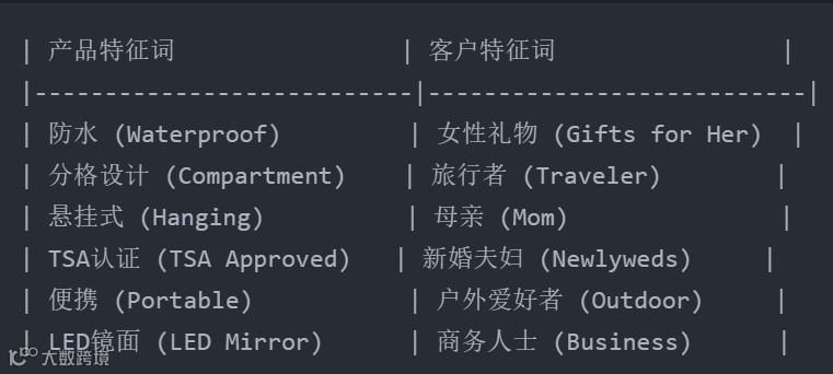 让DeepSeek基于关键词库,自动生成两大核心词表: 产品特征词:材质、功能、场景等卖点关键词 客户特征词:人群画像、需求痛点关键词