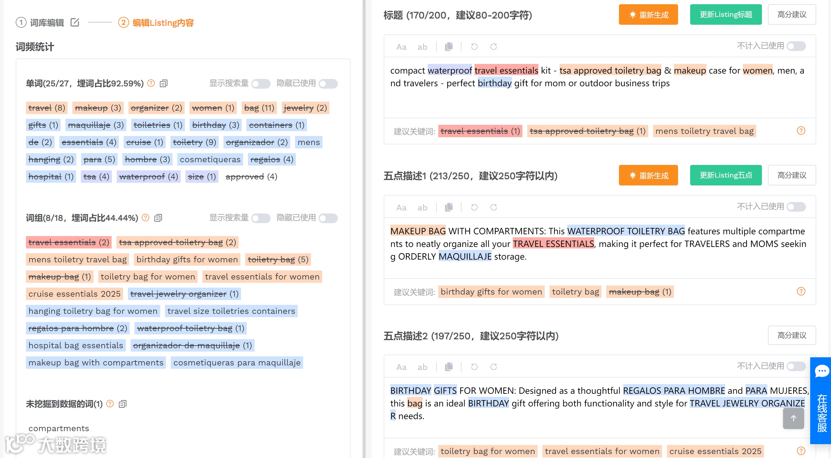 语言风格——正式/感性/鼓吹/有激情/有爆发力随心切换 品牌检测——一键知晓是否存在侵权的亚马逊品牌词 埋词占比实时监控——标题、五点描述、ST的关键词密度一目了然!