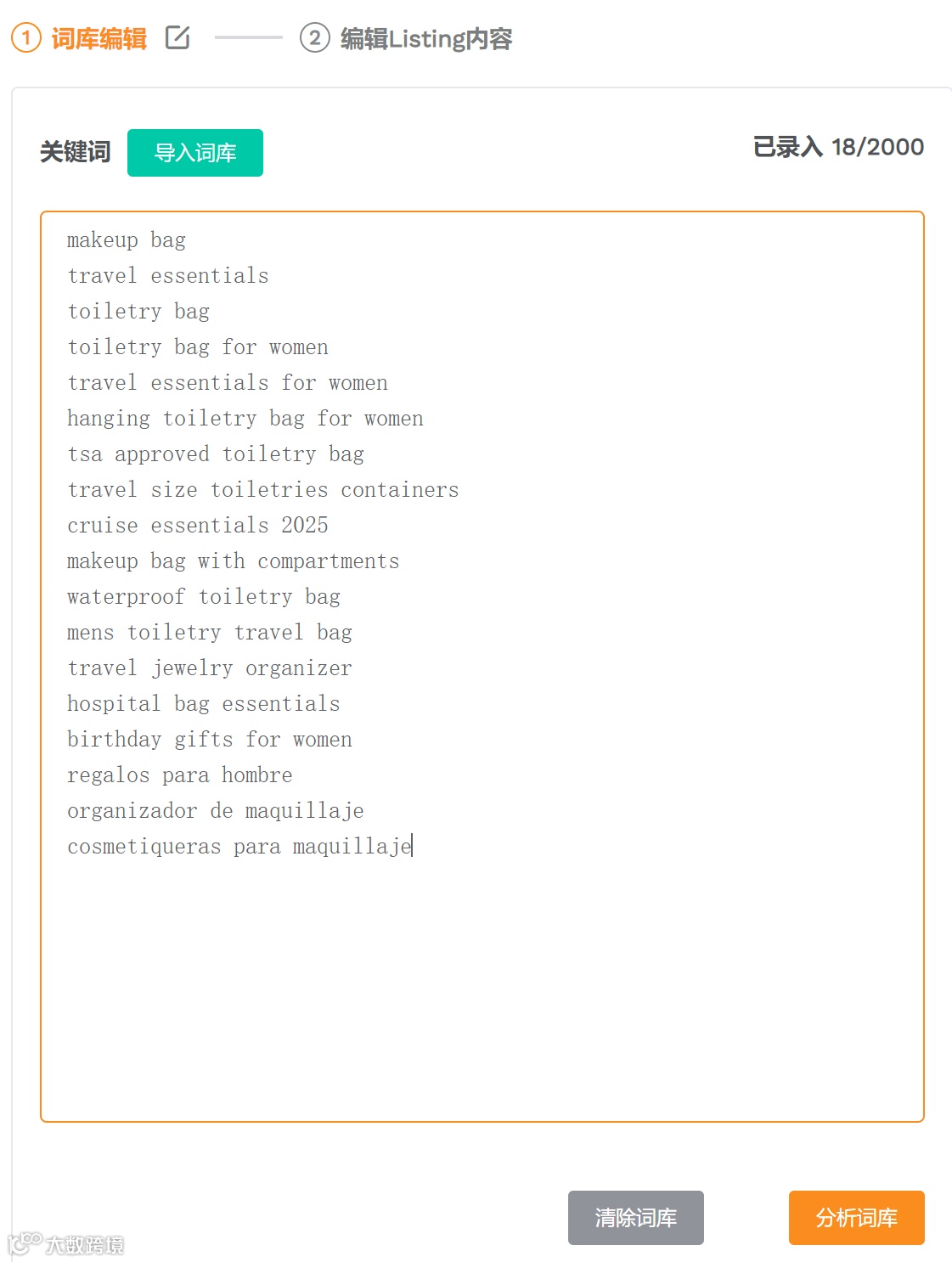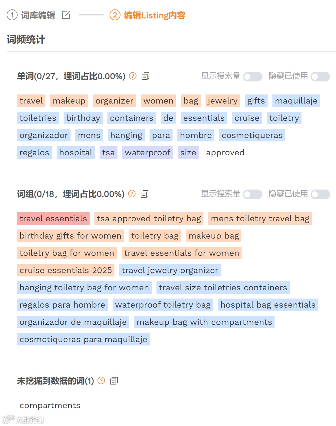 筛选后的“精华词库”直接同步到卖家精灵Listing生成器中的【词库编辑】,系统自动统计词频+推荐权重,一眼锁定核心埋词!