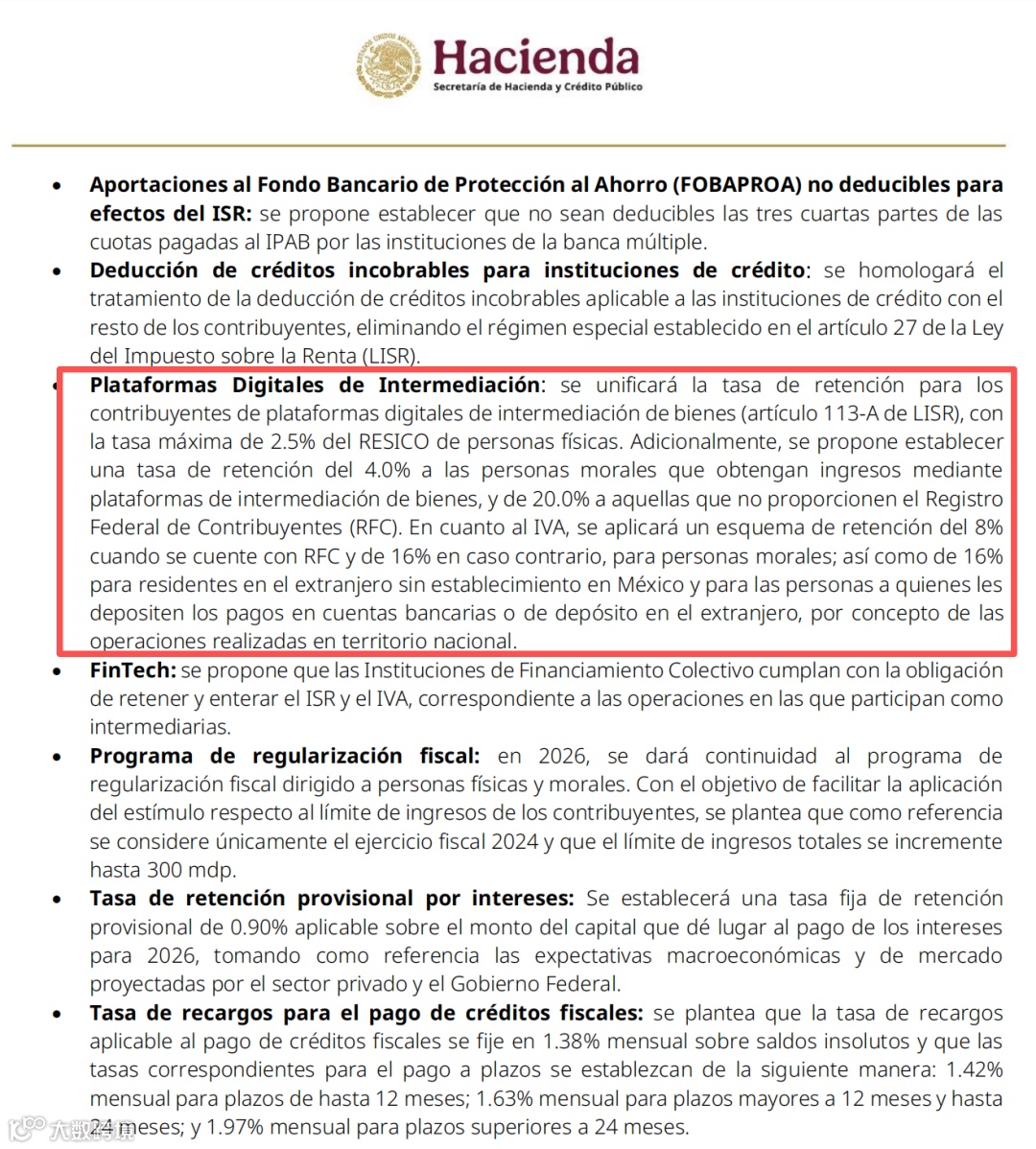 法案强制要求亚马逊、美客多等主流平台承担代扣代缴主体责任,直接从卖家销售额中预扣税款并上缴墨西哥税务局(SAT)。这意味着平台从 “交易中介” 转变为 “税务执行方”,监管触角直接延伸至每笔订单的资金流。
