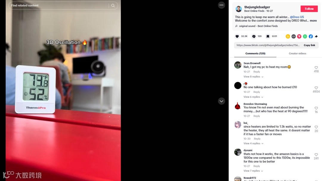 合作视频中@thejunglebadger他先提到说自己去年试过Amazon Basics的暖气机,开了半小时房间几乎没变暖,今年选择换测DREO全屋取暖器。并且特别用温度计做了真实场景评测,结果非常直观:半小时室温直接提升20度。